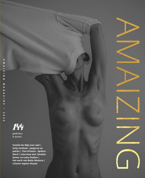 Ook op de tweede editie, Amaizing 2026, staat een fantastisch beeld. Een foto gemaakt door Marloes Fallaux (@by.fallaux op instagram) en ingezonden door de dame op de foto zelf Winde Hendrickx (@gevangen_in_woorden op instagram). De cover zet de toon voor de rest van het magazine met als thema Dichtbij, ook ditmaal vol prachtige kunstwerken, 144 gedichten en allerlei artikelen.